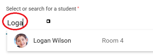 - Student - Start typing to narrow down the search or click the space bar to see all students. The room is included to help identify the correct student matching that name. Select the student you wish to admit. The students medical information will be displayed.