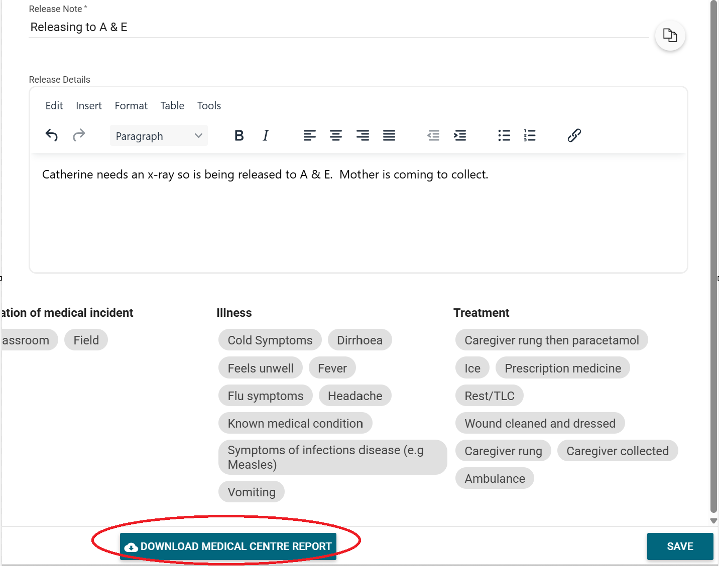6. If 'Sent to Medical Centre' or 'Sent to Hospital' is selected, the DOWNLOAD MEDICAL CENTRE REPORT will become available once the release note is entered. This contains the student, medical and caregiver details required by the medical centre along with the sickbay register details.