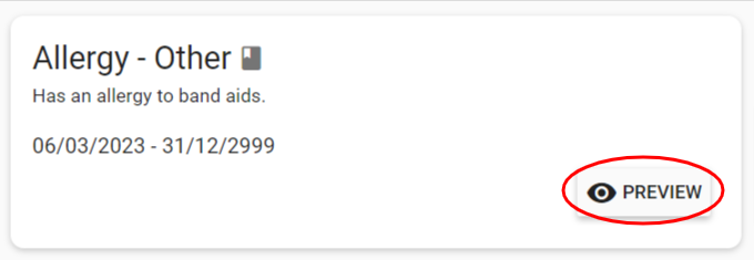 5. The content of all fields is displayed on the tab as either text or icons but you can click PREVIEW to view the full details as a popup. Medical conditions showing the PREVIEW button have been synced from ERN so are not editable.