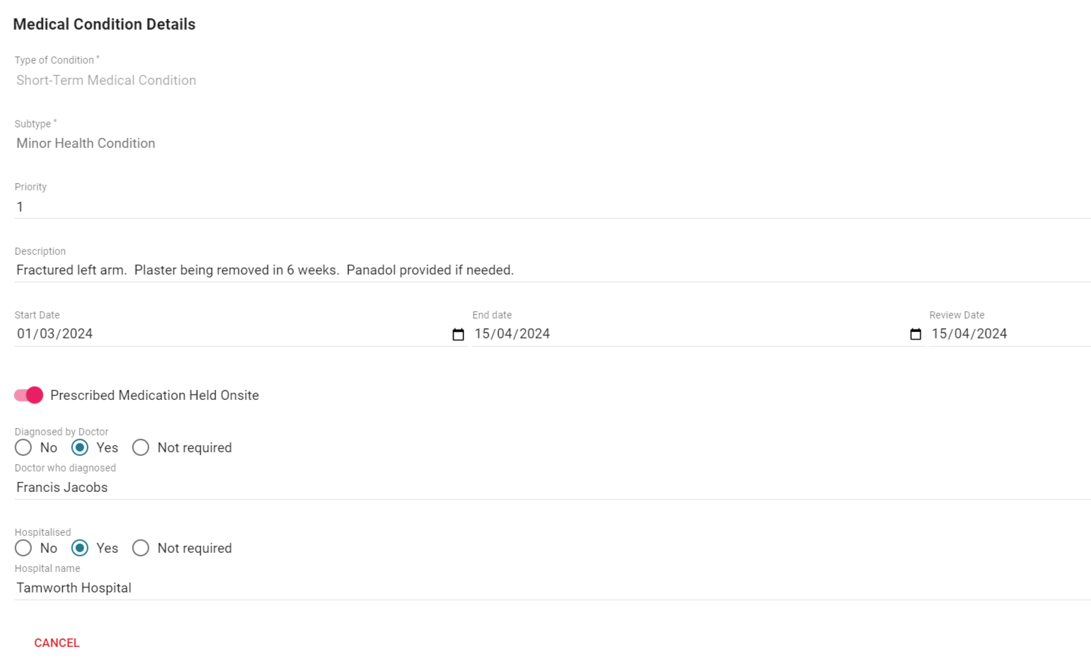 6. Enter all the available details for this medical condition. The Type of Condition and Subtype cannot be changed as these relate to the short-term nature. It is also not possible to view/update any severity sliders as all serious medical conditions MUST be entered into ERN.