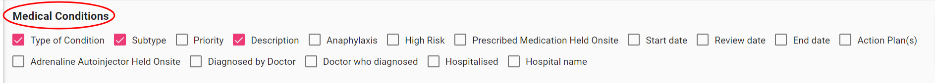 2. Scroll down to Medical Conditions to find all medical condition fields. Selecting the required fields from this section will print the fields for all 'current' medical conditions.