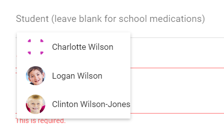 5. If the medication belongs to a student, start typing the student name and select from the dropdown list. If the medication belongs to the school, leave the student field blank.