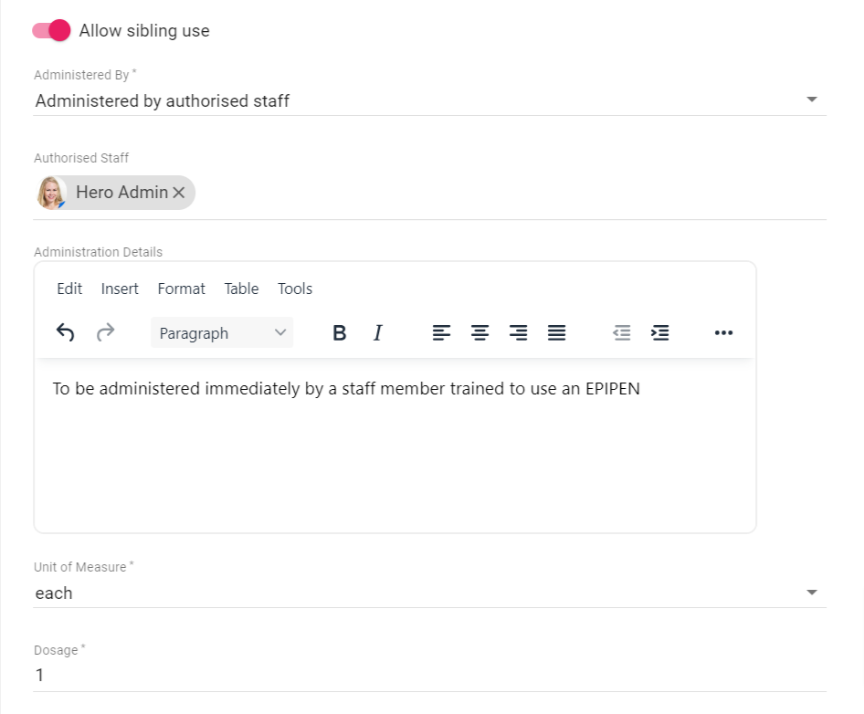 - Allow sibling use - Click this for a general medication that can be applied to a sibling if required Note: this option is not available to NSW schools
