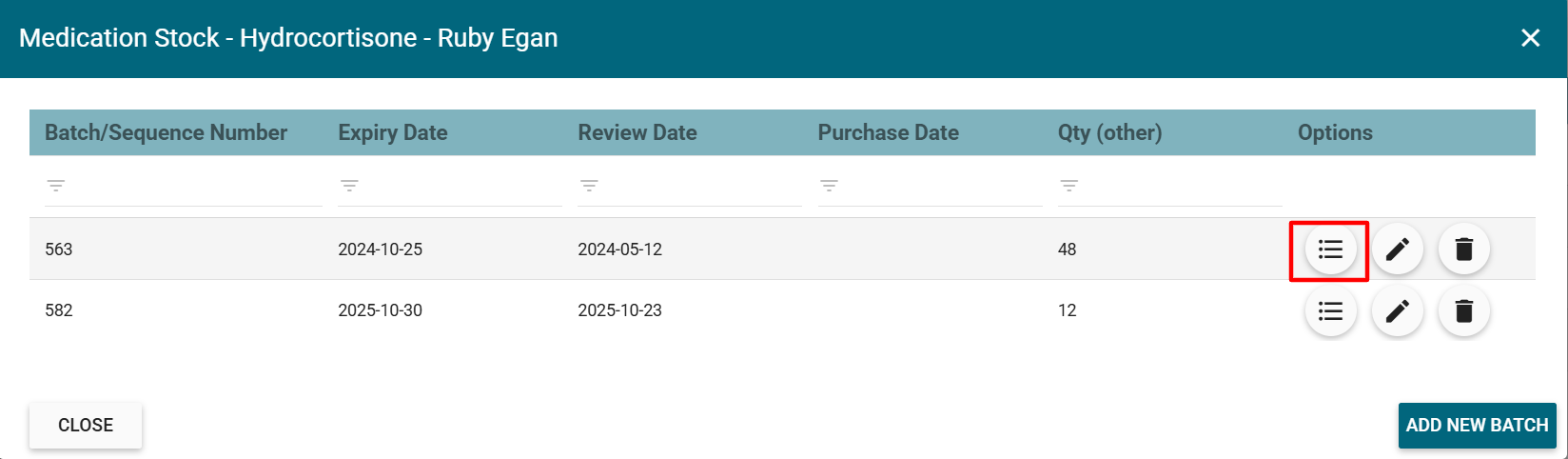 1. If the Stock icon was used, a list of all current stock will be displayed. This is a good opportunity to give this medication a quick stocktake to ensure accuracy of stock records. To add a new batch of stock, click ADD NEW BATCH.