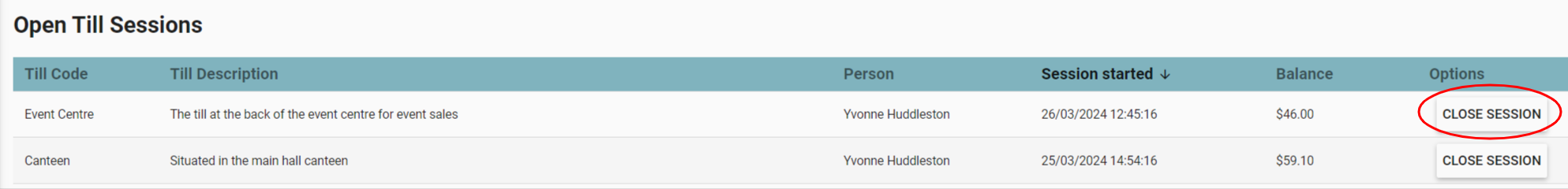 2. If payments have been receipted for this till since the last till session closure, a CLOSE SESSION button will be available for the user who receipted the payment. Click to close and reconcile the till.