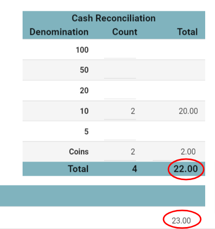 3. Reconcile the contents of the till by entering the denomination counts in the area provided. The total entered MUST equate to the Cash amount. (Note: if multiple users have receipted payments for the same till, reconciliation will need to be carried out in conjunction with each other).