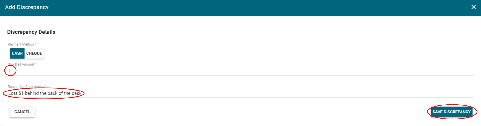 4. If the cash/cheques/money orders in the till do not equate to the cash/cheque/money order balance expected, and the issue cannot be resolved, a Discrepancy will need to be entered to enable the reconciliation to balance and proceed.
