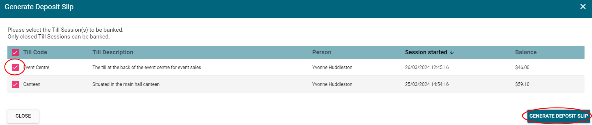 - Generating a Deposit Slip - Bring all closed tills together to prepare the deposit slip to take with the banking. Deposit slips need to be verified by an independent user.
