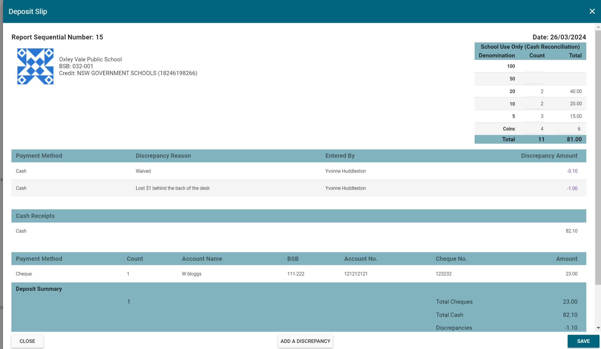 6. The discrepancy amount will now be recorded and will enable the banking to proceed. Click SAVE to accept the reconciliation. The SAVE button will not be enabled if it fails to balance.