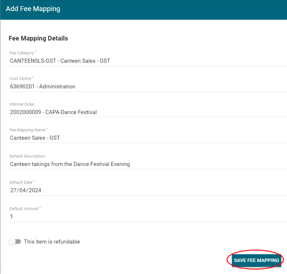 - Click the This item is refundable slider if the fee can be cancelled and any payments refunded. Something used immediately e.g. food would not have this clicked.