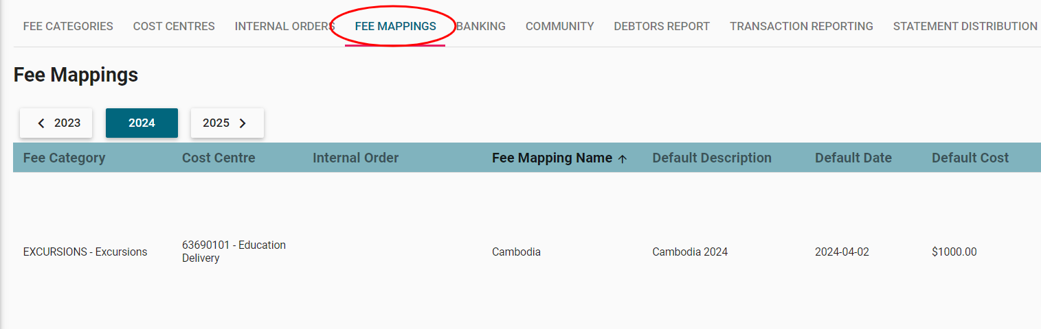 3. Click FEE MAPPINGS to display a table of existing entries. A Fee Mapping that was used in the previous year can be brought forward by copying to the current year and amending the Default Date. Check the previous year before you create a new one, to see if you would prefer to bring an existing one forward.