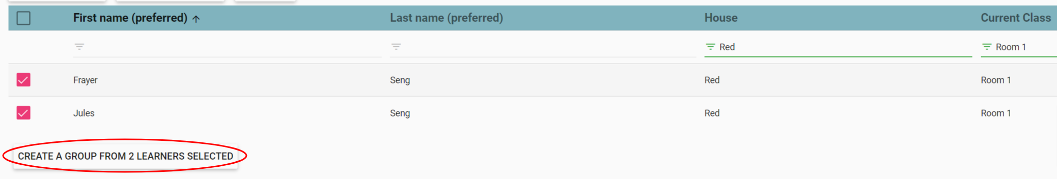 7. You can create a group from your list. Click the students to be included in the group. Click CREATE A GROUP FROM <9> LEARNERS SELECTED.