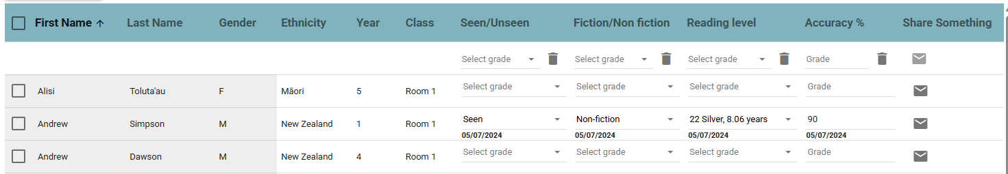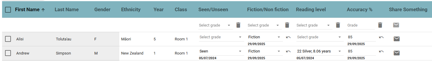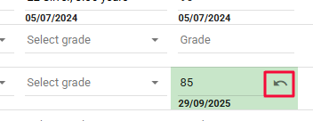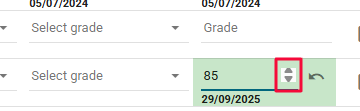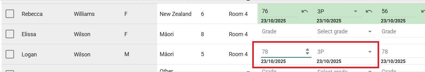 7. Where a previous assessment score has been entered, this will be displayed as a placeholder (i.e. greyed out). This is particularly useful if you wish to retain the same grade for the current assessment entry. Overtyping the field with the same value will register that grade again for today's date.