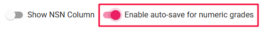 If the Enable auto-save for numeric grades slider is turned on, the numerical grade will automatically save. If this is turned off, you will need to click the SAVE button after entering the grade: