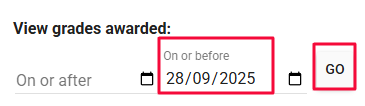 1. Under View grades awarded, enter an 'on or after' or 'on or before' date, or select a date from the calendar, and click 'Go'