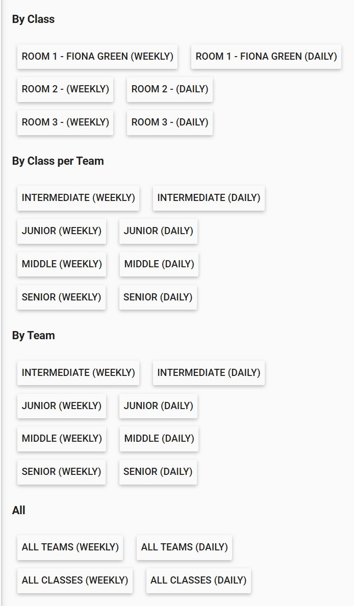 Class List Downloads - These are your daily or weekly paper rolls which are available by Individual Class, Individual Class per Team or Whole Team. It is also possible to print all Classes or Teams at once.