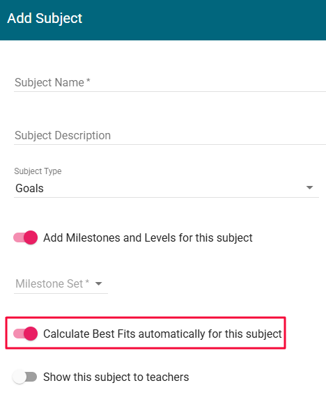 8. If your school wishes to automatically calculate Best fit curriculum levels for the subject, set the Calculate Best Fits automatically for this subject to yes (red)