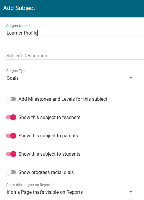 10. If your school wishes to make the subject visible to parents set the Show this subject to parents setting to yes (red)