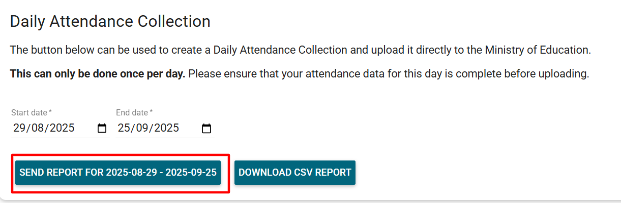 Your attendance report for the day selected will be generated and automatically sent to the Ministry of Education. You will receive this notification that it is successful.