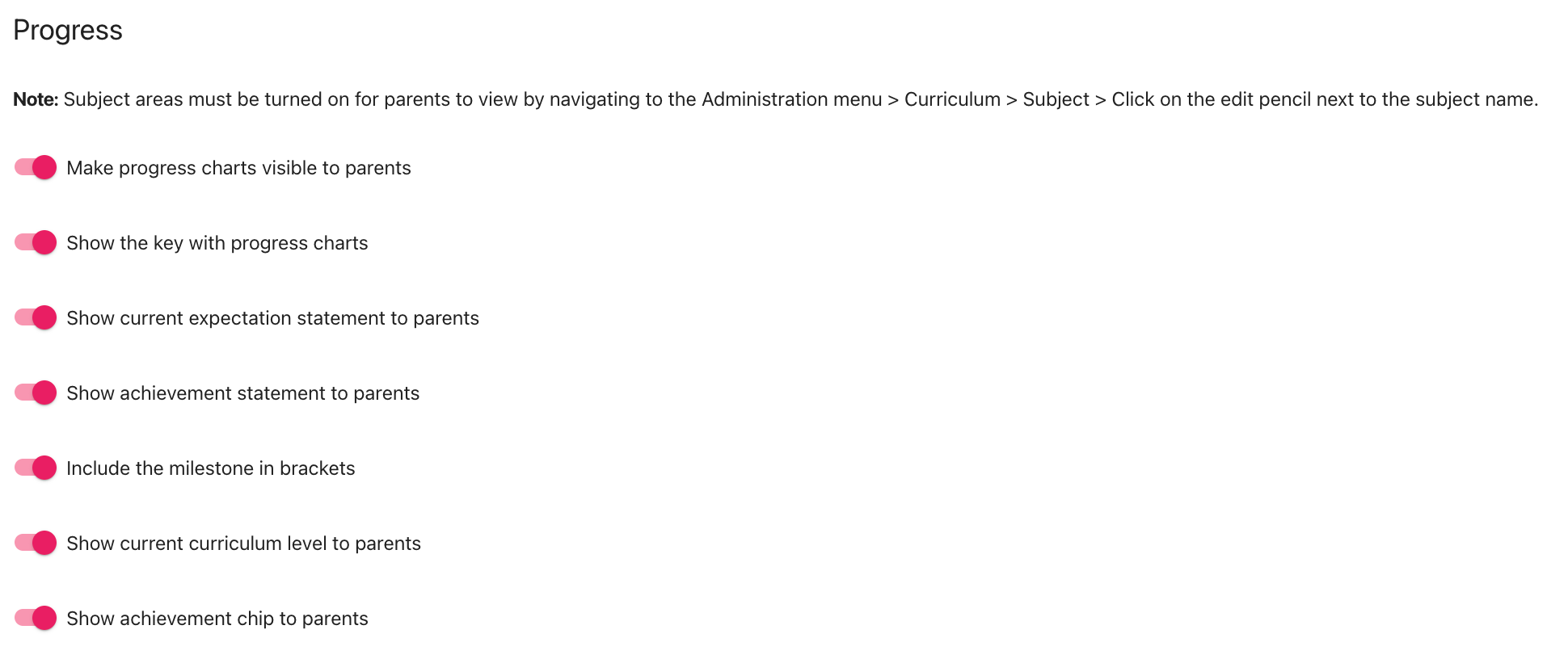 These are the options for you to choose what aspects of Progress you wish to share with parents and whanau.