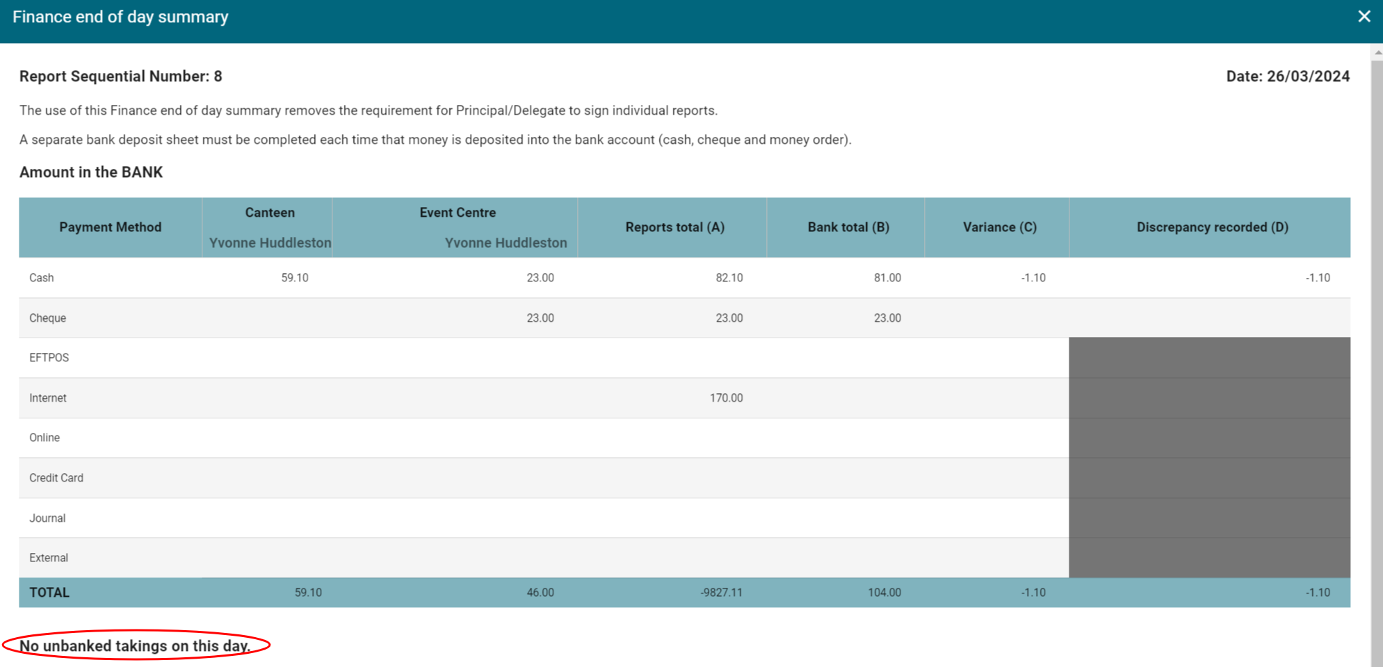 4. The Daily Summary will be produced. Receipts from all sources will be displayed in the appropriate columns. If tills have been closed but a deposit slip has not yet been created, these takings will be displayed under in the table designated for Unbanked takings.