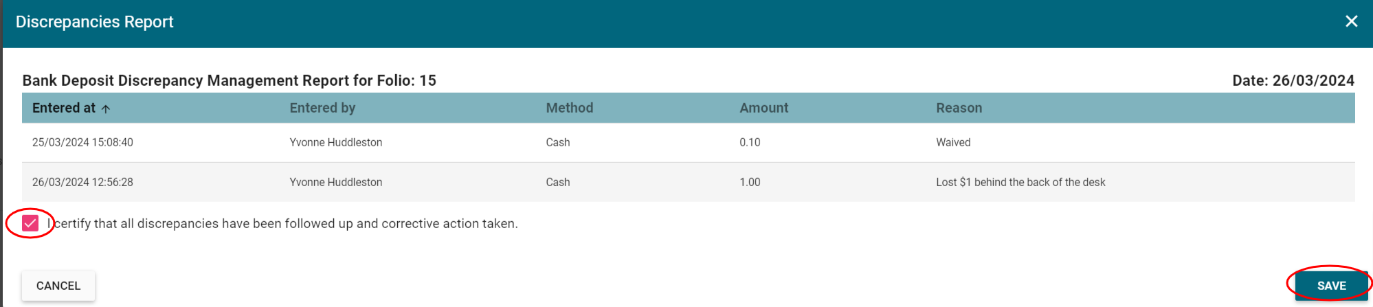 It also reports on any discrepancies, refunds, cancellations or changes that require verification by the Principal or Principal's delegate.