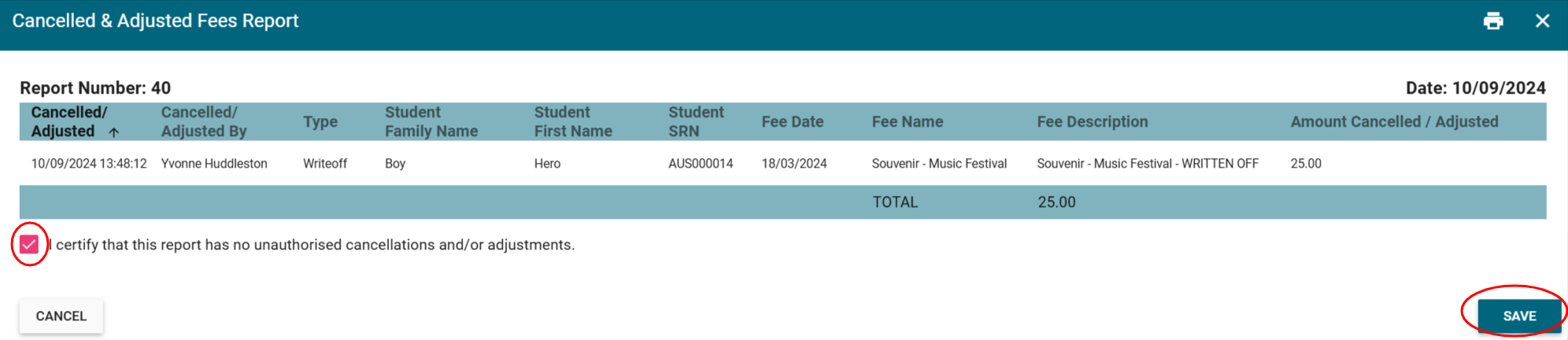 - Cancelled & Adjusted Fees - displays a list of any Voids, Partial Voids, Discounts or Write Offs