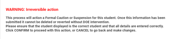- Once the formal caution has been created any editing of detail via this process will NOT update the letter. An already created letter can be edited or deleted by a Principal or Principal's Delegate via the designated Suspension Letter page. This will amend the post only.