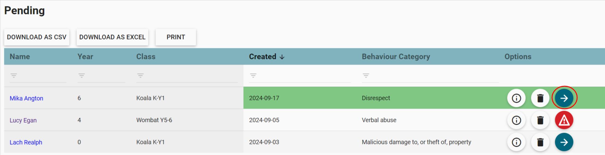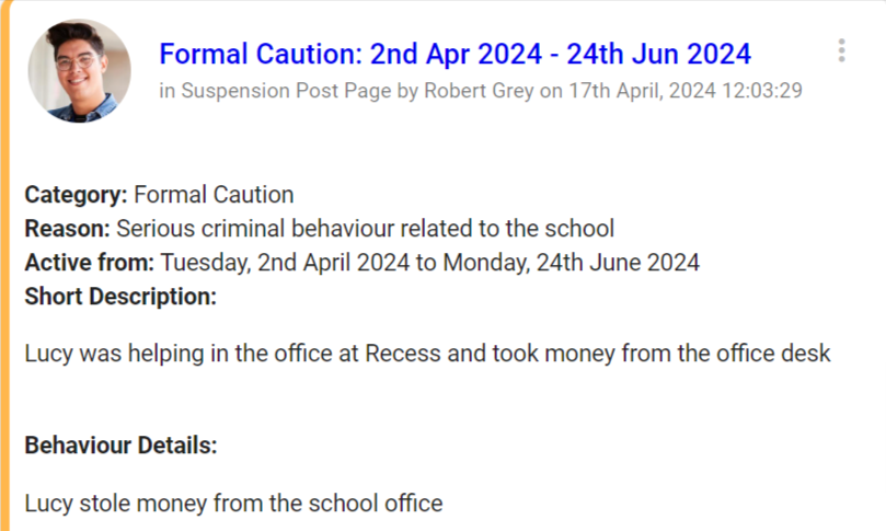 7. If you are a Principal or Principal's Delegate, click the arrow to create the Formal Caution. If you are not a Principal or Principal's Delegate you will only see the information icon which shows the behaviour incident post. The red alert indicates that DEL approval is required. This will be addressed later in this article. NB: A Formal Caution can be deleted but a Suspension cannot.