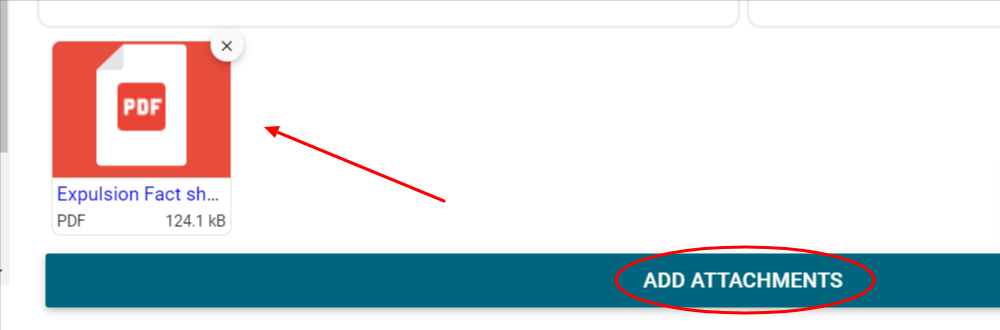 12. The system is designed to enable documentation to be sent to caregivers. Click ADD ATTACHMENTS to upload any supporting documentation required by the caregiver. This will show as a post attachment on the Suspension Letter page.