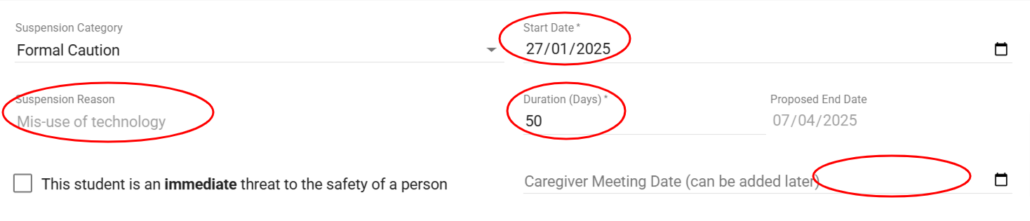 - The Suspension Reason will be pre-populated with the Behaviour Category and cannot be edited. If the category of 'Other - Behaviour of Concern' was previously selected a Details field will be available for further information.
