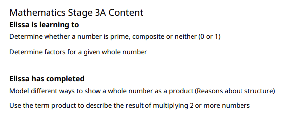 Curriculum content progress, goals, assessments and supporting comments.