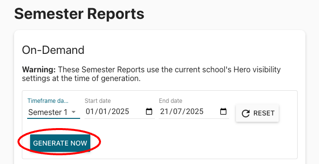 A Hero Administrator also has the option to generate a snapshot for a specified report period on demand if required. On-demand reports will include content consistent with your report settings as at the time of generating the report.