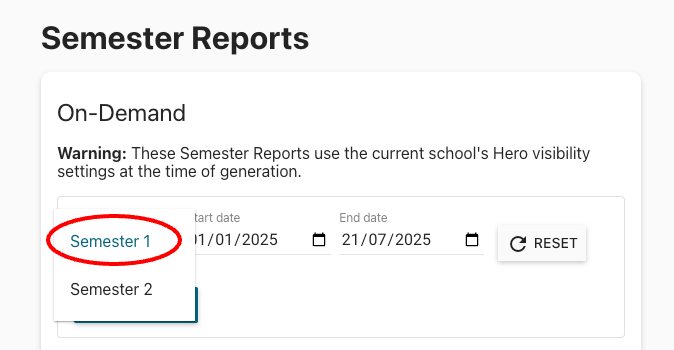 Semester Reports are a printable PDF report that schools are able to download and save/print. They are created by a school's Hero Administrator. Semester Reports use the online progress summary page settings of the school at the time the Report was generated, and can be downloaded for individual students or for the whole school.