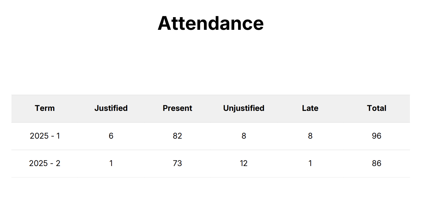 an attendance summary table for the report period.