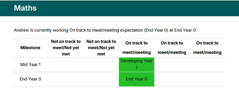 A student's online progress summary page is a summary of all the learning content from the start of the year up to the current date. Schools can decide which pages' content will appear on this summary by making the page visible on the student report page - see Editing Page Settings