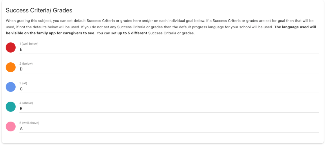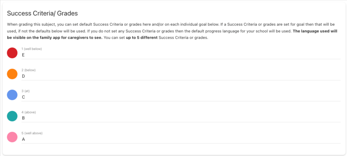The default success criteria/grade colours and wording is taken from your Progress terminology set in your Progress Reporting Options - Customising the Progress Reporting Options