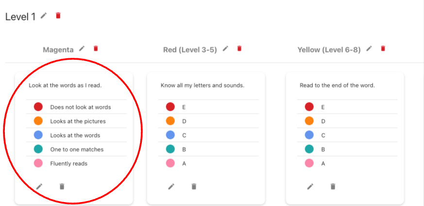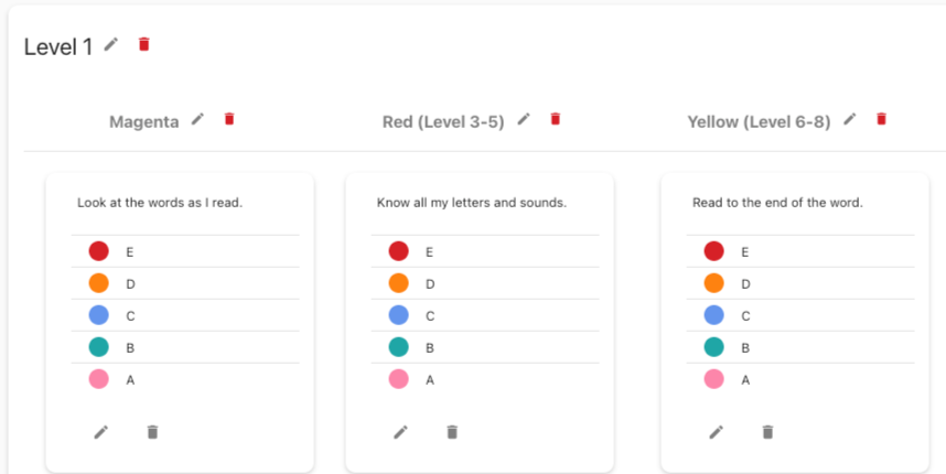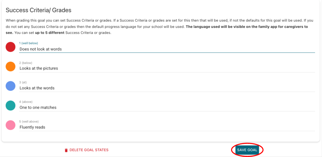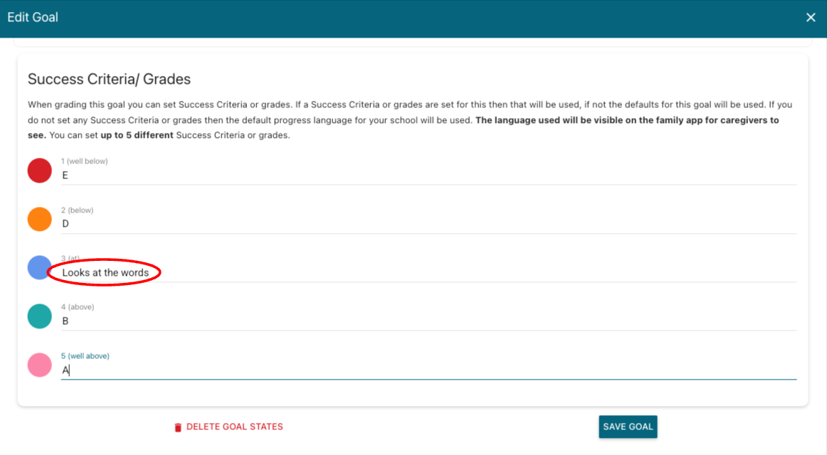 The grades will always be set with 1 as the lowest/least successful option through to 5 as the highest/most successful. We recommend you enter the criteria that matches 3 (at) first and then enter your other criteria around this.