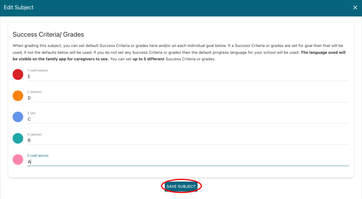 Scroll down to the Success Criteria/Grades options and make the required changes as per steps 1-4 in Customising Grades for a Subject above.
