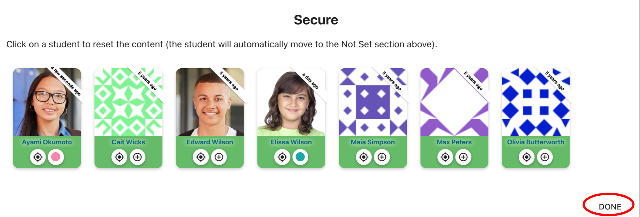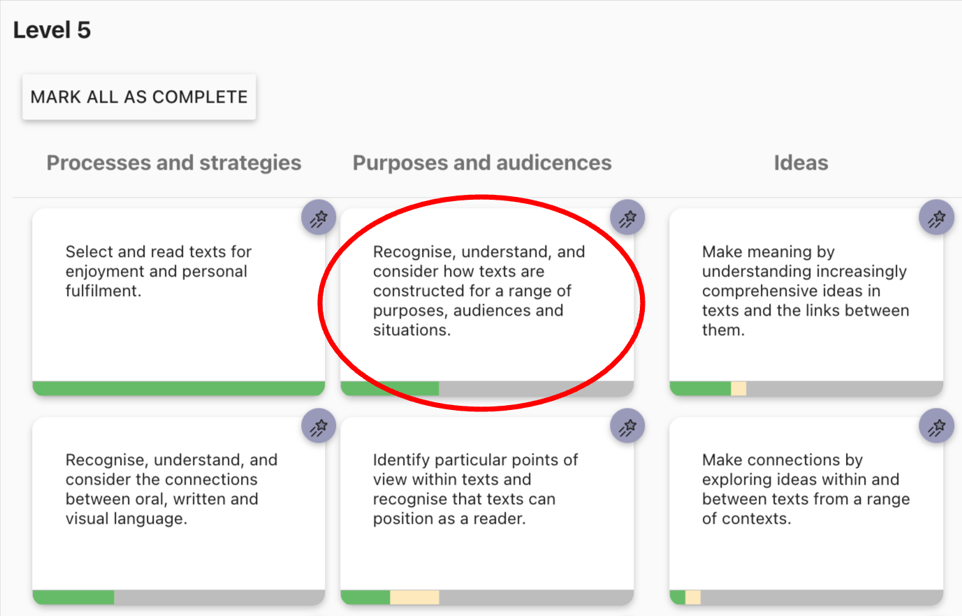 15. The grade icon will now show the progress colour and when hovered over will indicate the associated grade. If the goal/outcome was not COMPLETE (green), it will now be in the Secure area. You can click on the goal/outcome card to move it back through NOT SET (white) to CURRENT (buff).