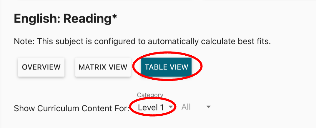 5. In TABLE VIEW select the level of curriculum content if higher than the lowest level