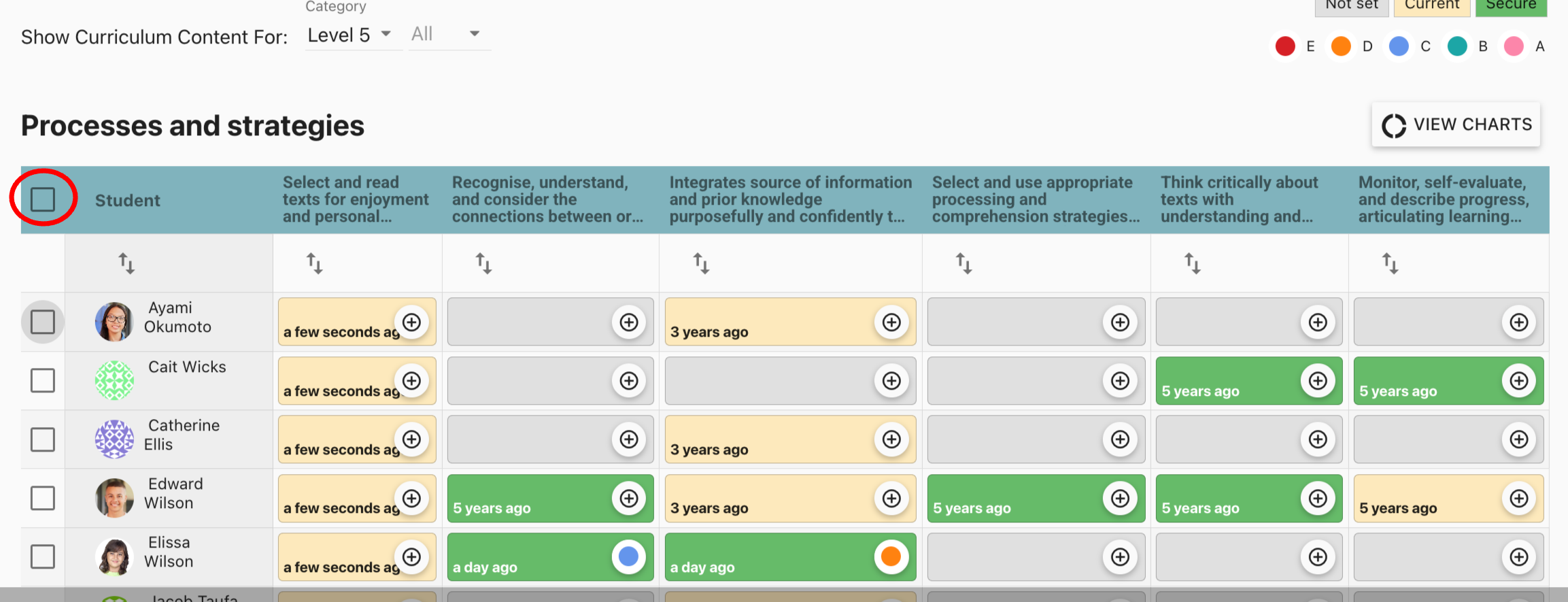 6. Find the goal/outcome you wish to grade in the tables. Select the students to grade either by ticking the individual checkboxes, or select them all with the checkbox at the top. You can unselect by clicking on the checkbox again.
