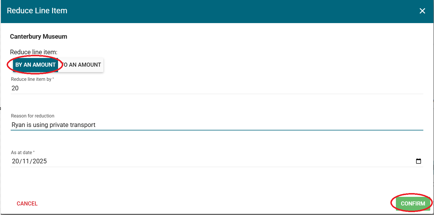 4. You have the option to enter either the amount you wish to decrease the line item BY or the amount you wish to decrease the line item TO. Click the required option, enter the relevant amount, enter the reason for the decrease and click CONFIRM to process.