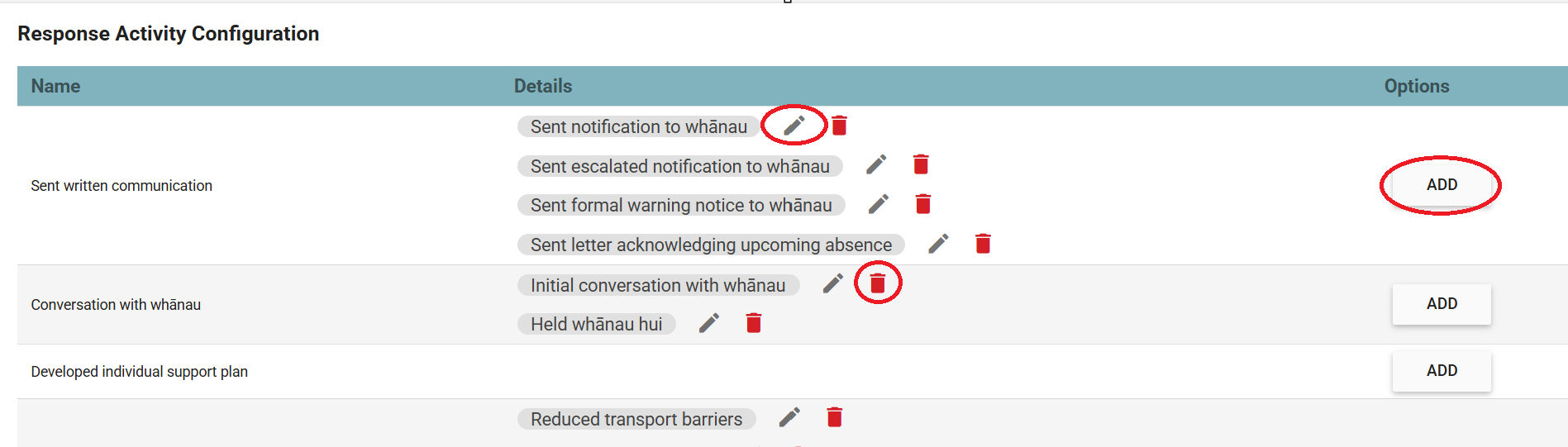 5. The MoE has developed a set of Response Activity Configuration categories. Within each category any staff member with Administrator access is able to add specific school-based responses. These are selected when adding a response entry to an individual student.