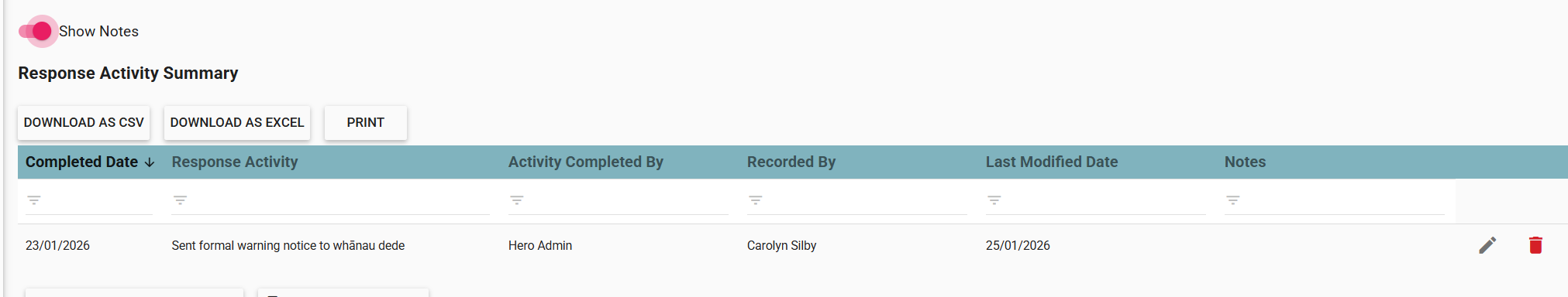 5. Below the table, you will see all responses previously sent. The Response Activity Summary has filtering and sorting features to provide greater analysis. If your staff access is sensitive or greater, click Show Notes to view any sensitive notes relating to the activity.