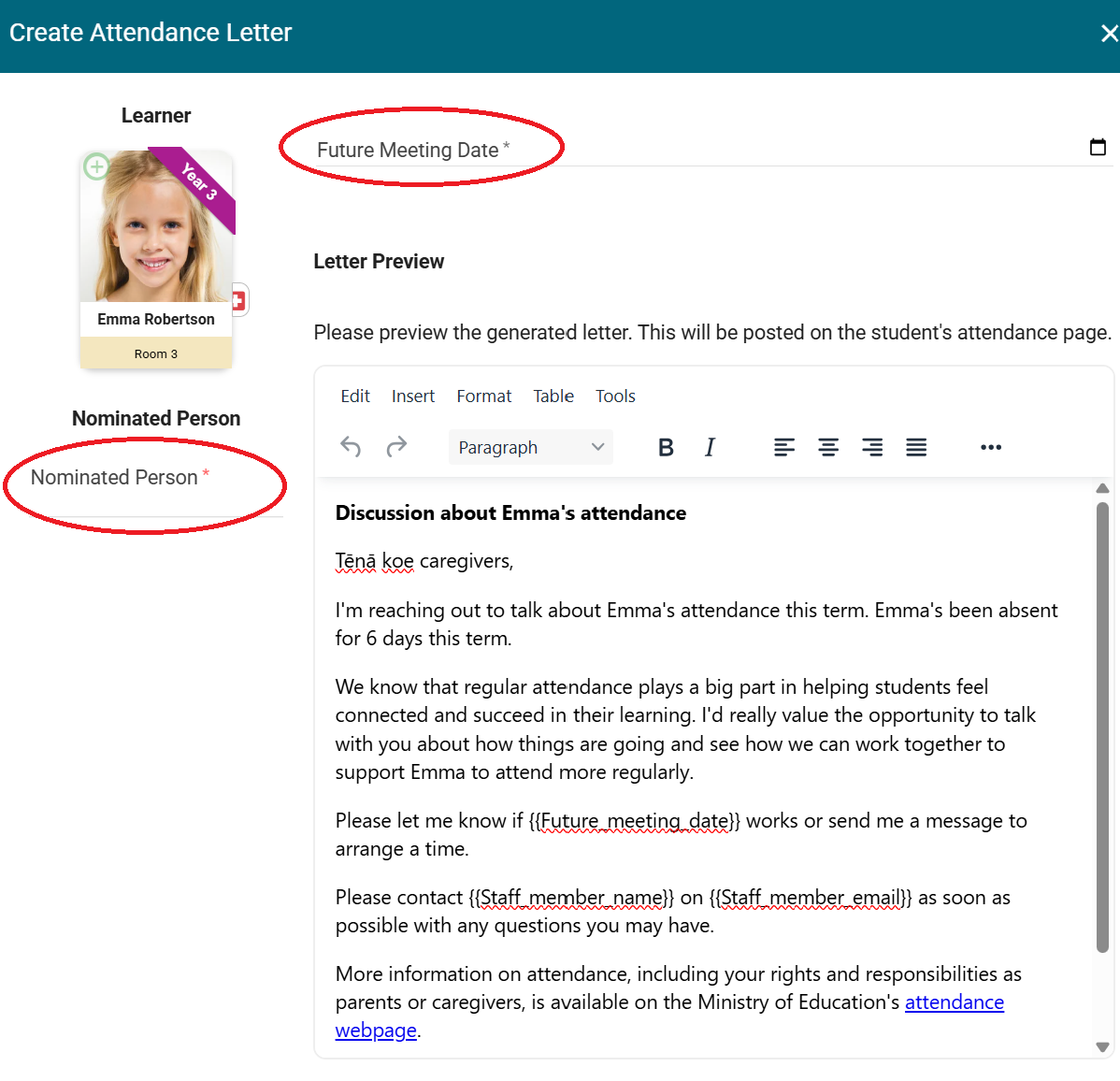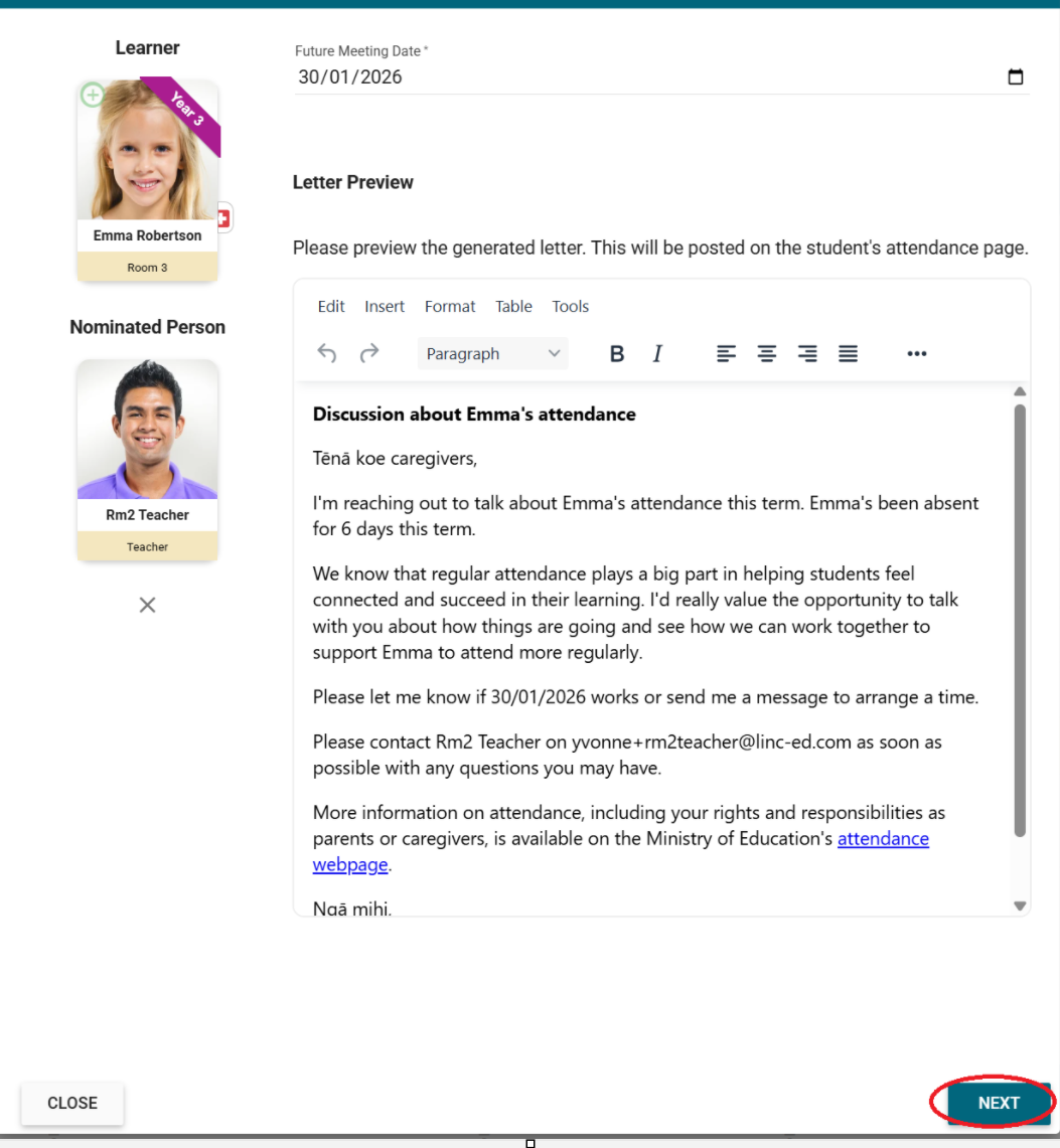 5. An editable copy of the attendance letter for the student's current threshold will be displayed.