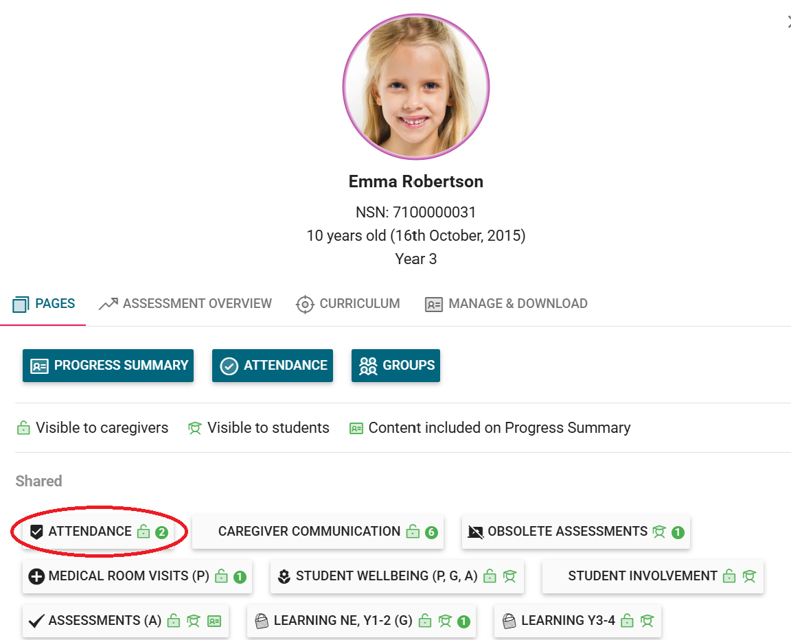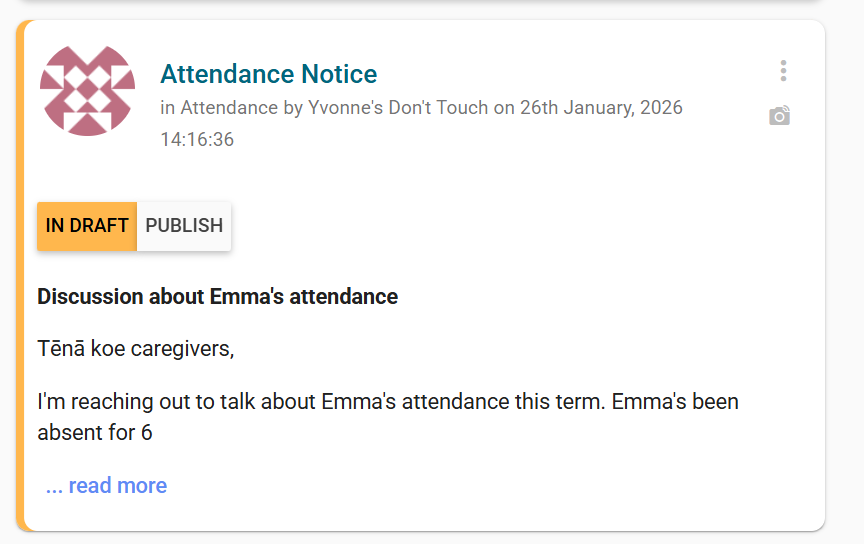 8. The post has been created on the student's Attendance page. This is created as a Draft so will not be visible to the caregiver until Published.