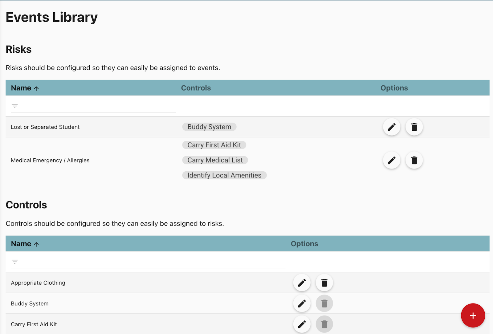 - To create a new Risk or Control click the red plus button