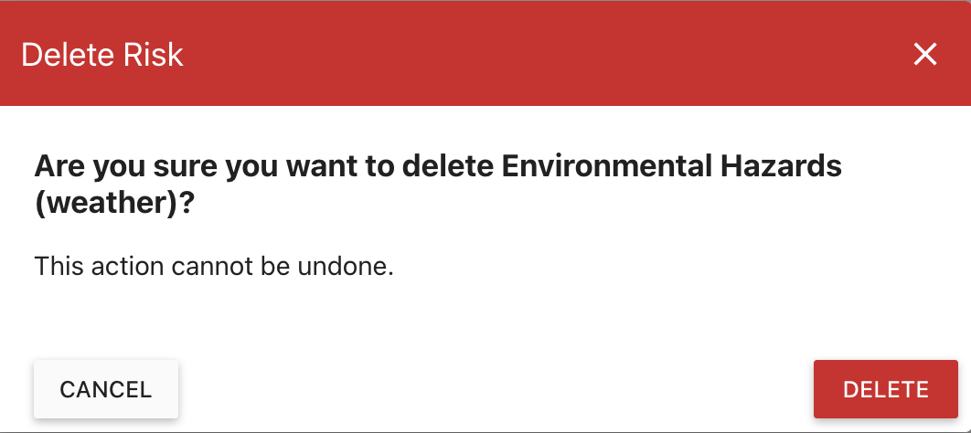 Confirm by clicking DELETE or click CANCEL to go back. Deleting a risk or control cannot be undone.
