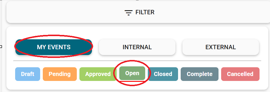 The key at the top of the calendar will show you what each colour event is. Click on the buttons in the key to filter and show only these events. e.g. Select MY EVENTS and Open to show events that are accepting responses.